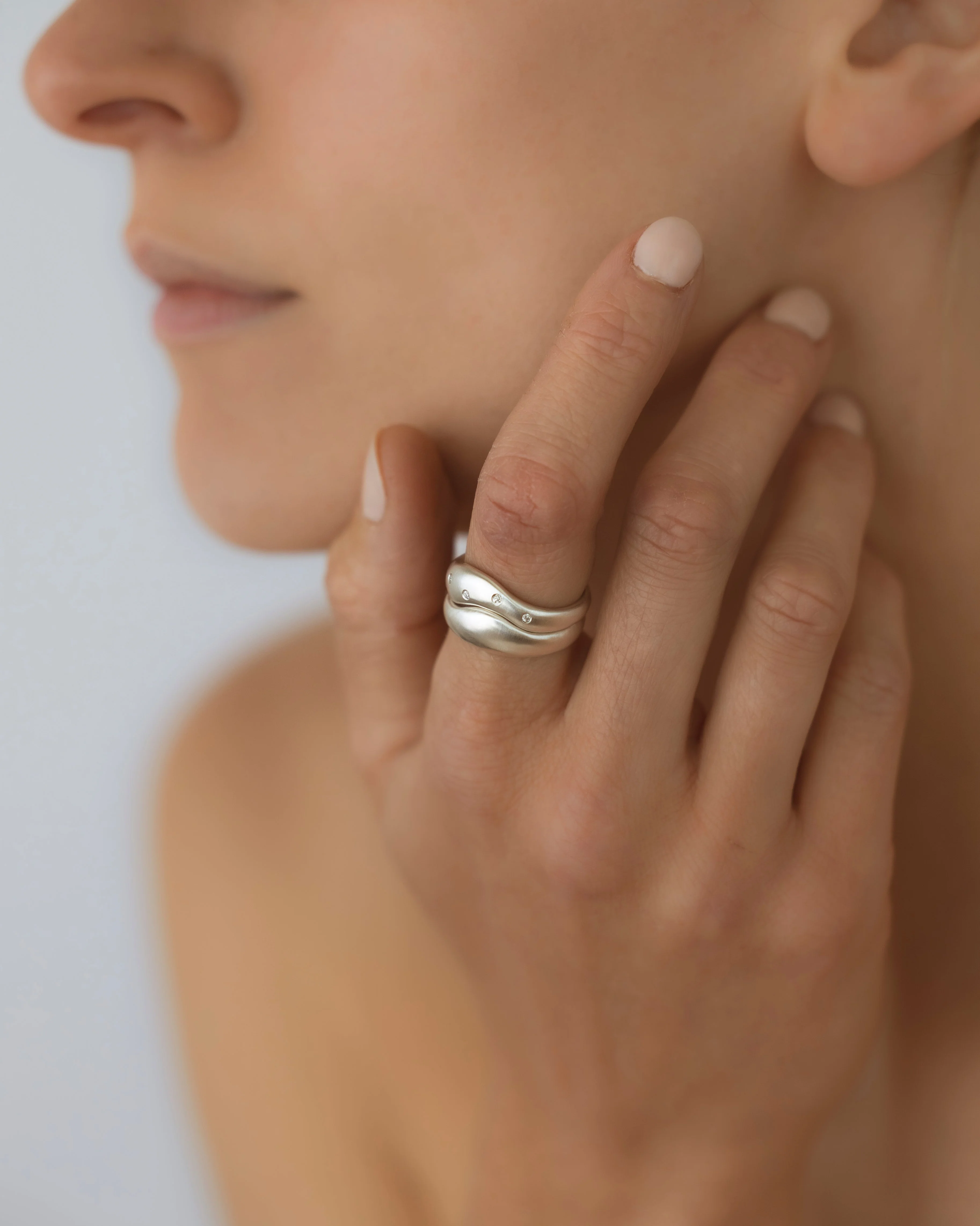 Goddesses of the Lune collection - these smooth curved rings meld together into unique stacks reminiscent of the silvery curves of the aurora featuring a flush-set Natural Diamond or Moissanite evoking the shimmering orb of the night - keep the wave plain or add extra sparkle with an array of bright Natural Diamonds or Moissanites options.