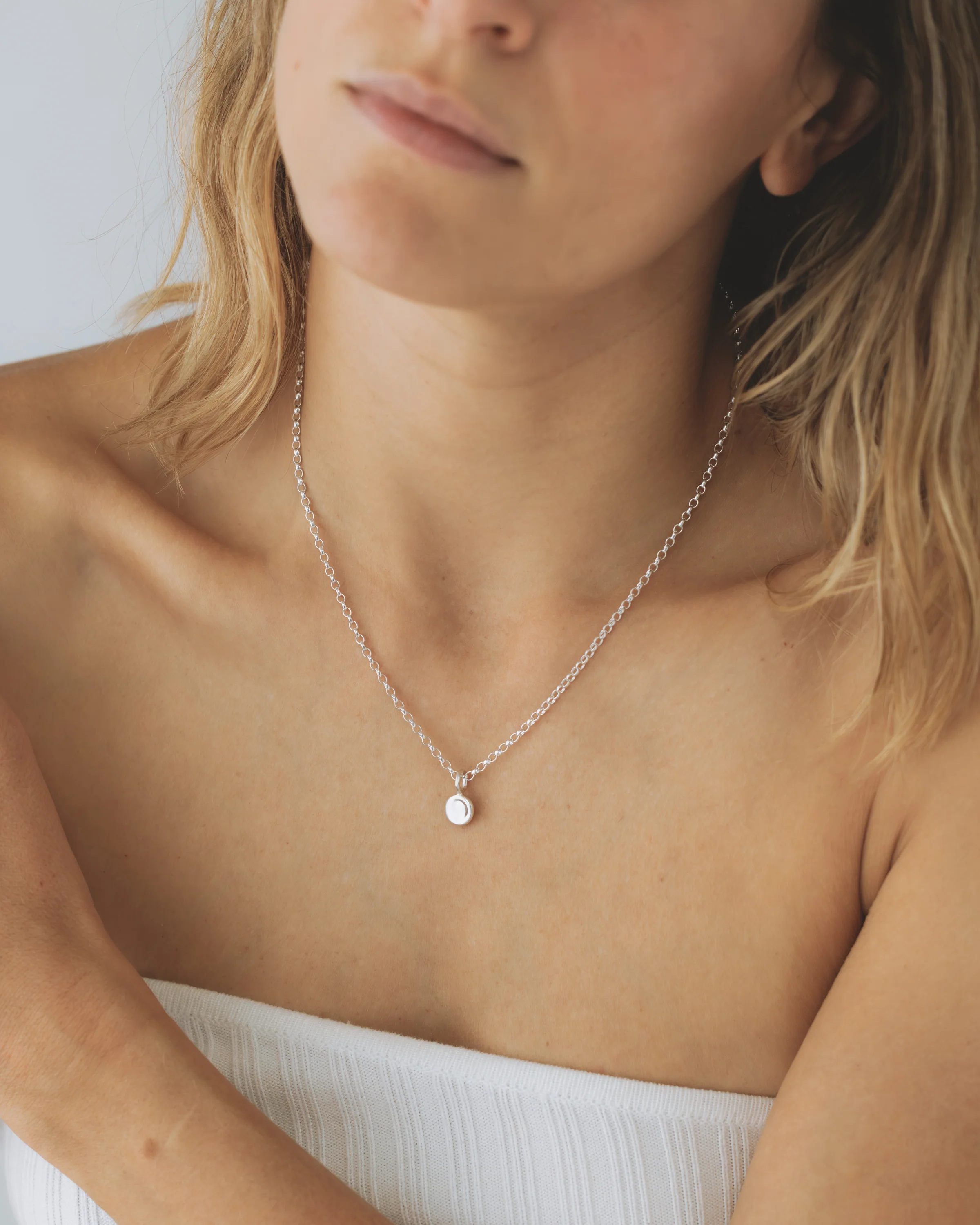The Baby Moon Birthstone Necklace embodies our signature molten and organic form in a mini silver disc, its buttery curves & fluidity echoing the imperfect beauty and strength of motherhood.