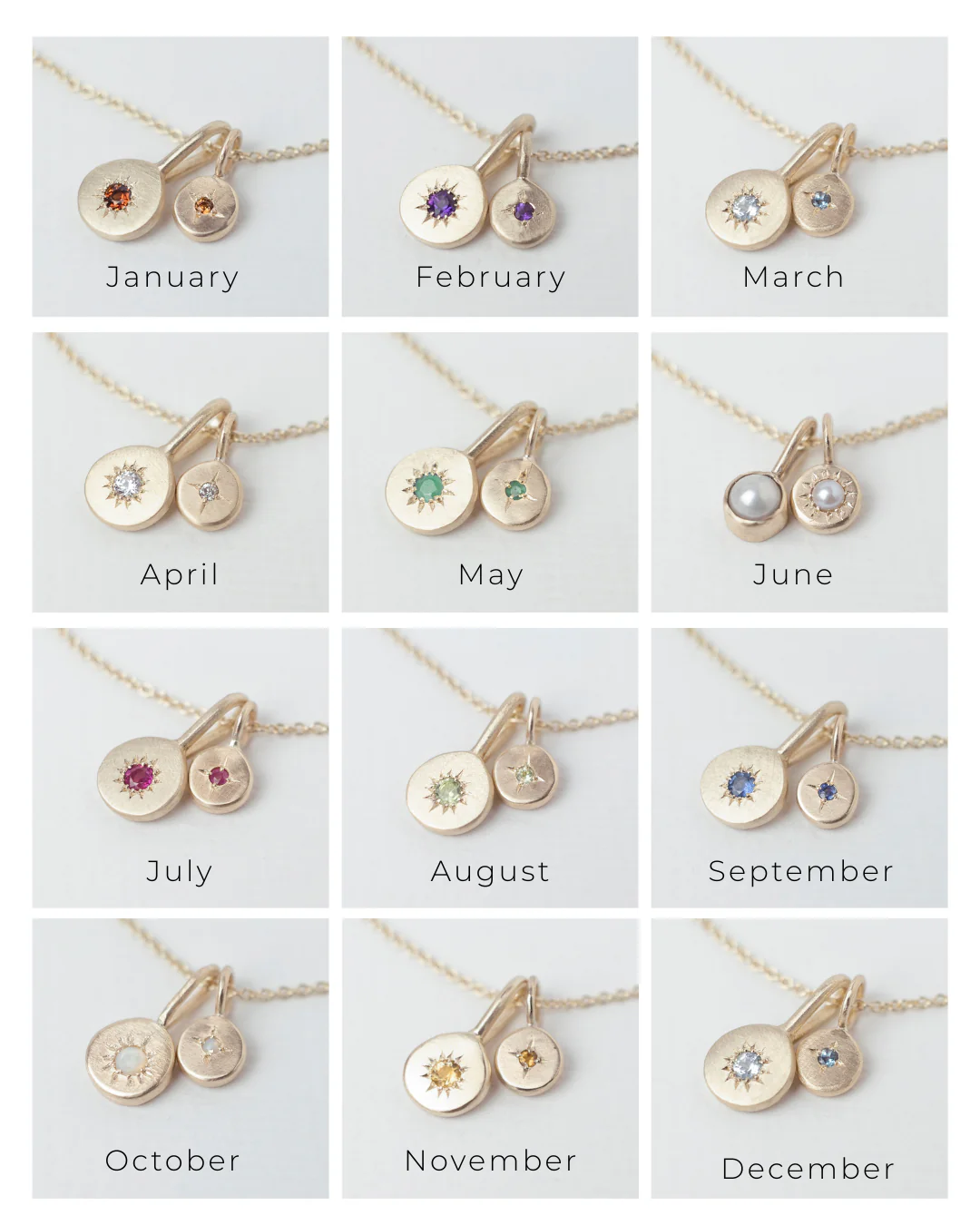 The birthstone necklace stack features two of your chosen gemstones in both a birthstone pendant and a mini birthstone pendant. The pendants are chunky little recycled gold pendant featuring your birthstone in a star setting. From January garnets to December tanzanite, the pendants can be worn on their own or stacked with the minis to represent you or your loved ones.