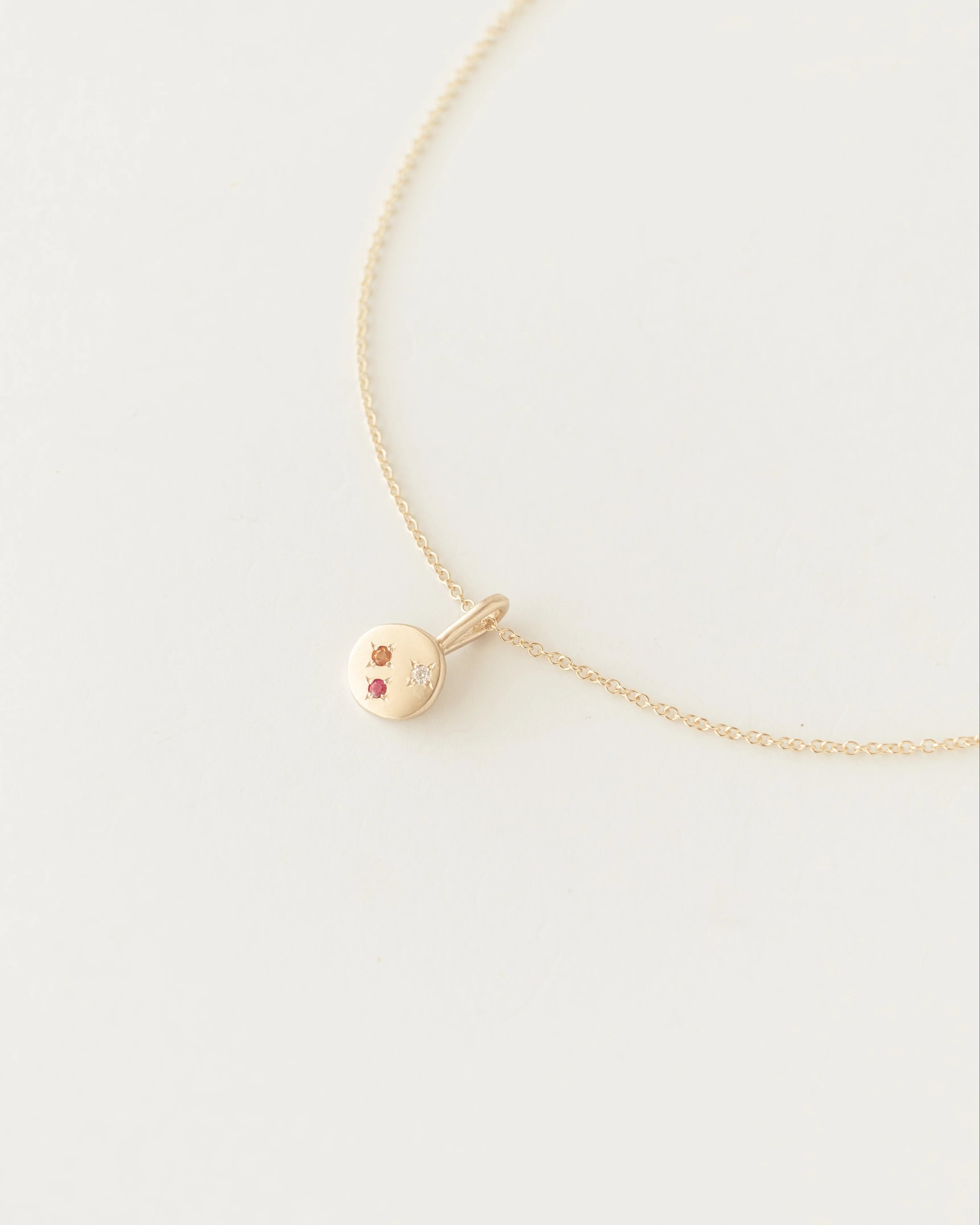 The celestialĀ necklace is a chunky little recycled gold pendant featuring three gemstones in your choice of setting, like little glimmering stars in a golden sky.