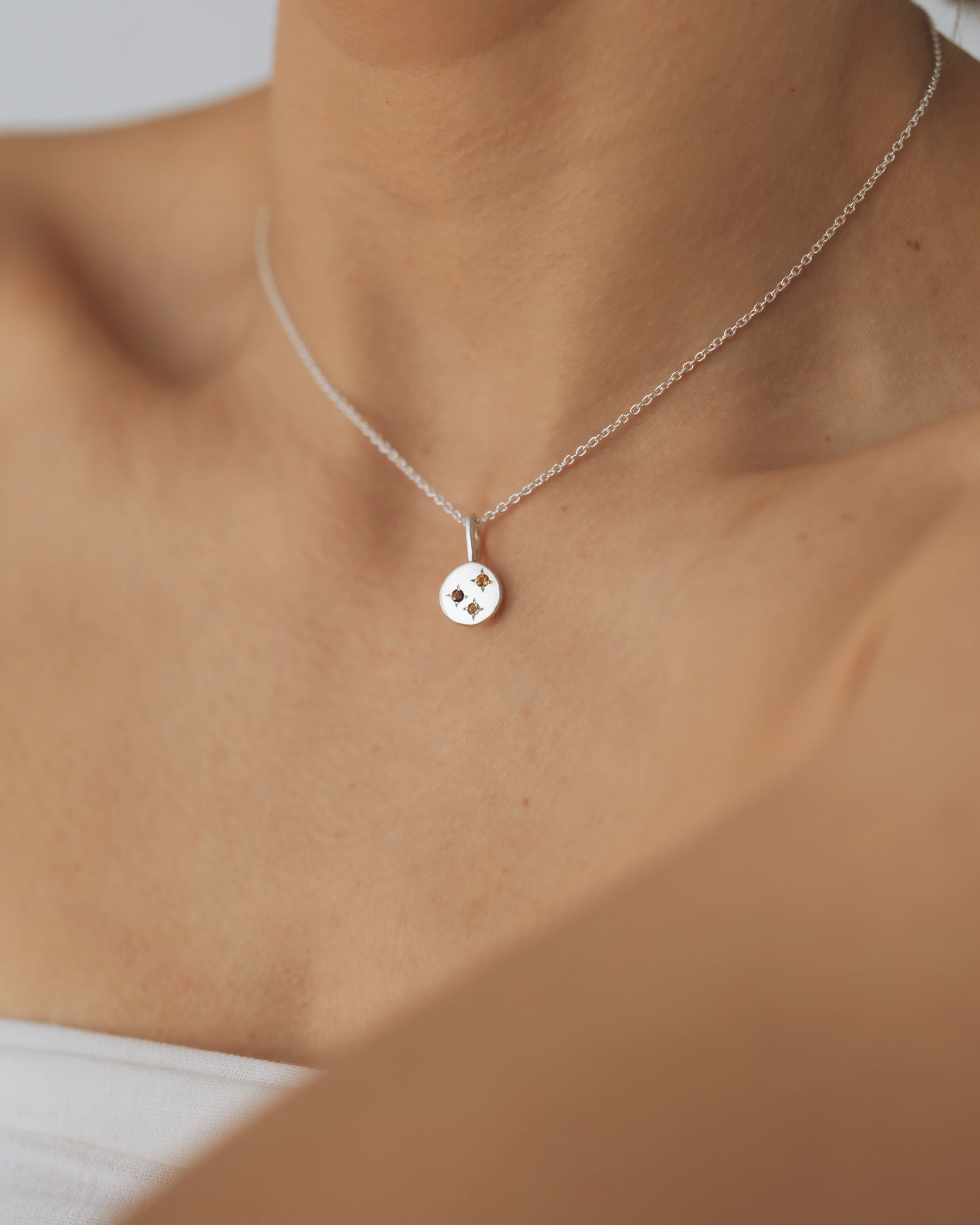 The celestial necklace is a chunky little recycled silver pendant featuring three gemstones in your choice of setting, like little glimmering stars in a silver sky.