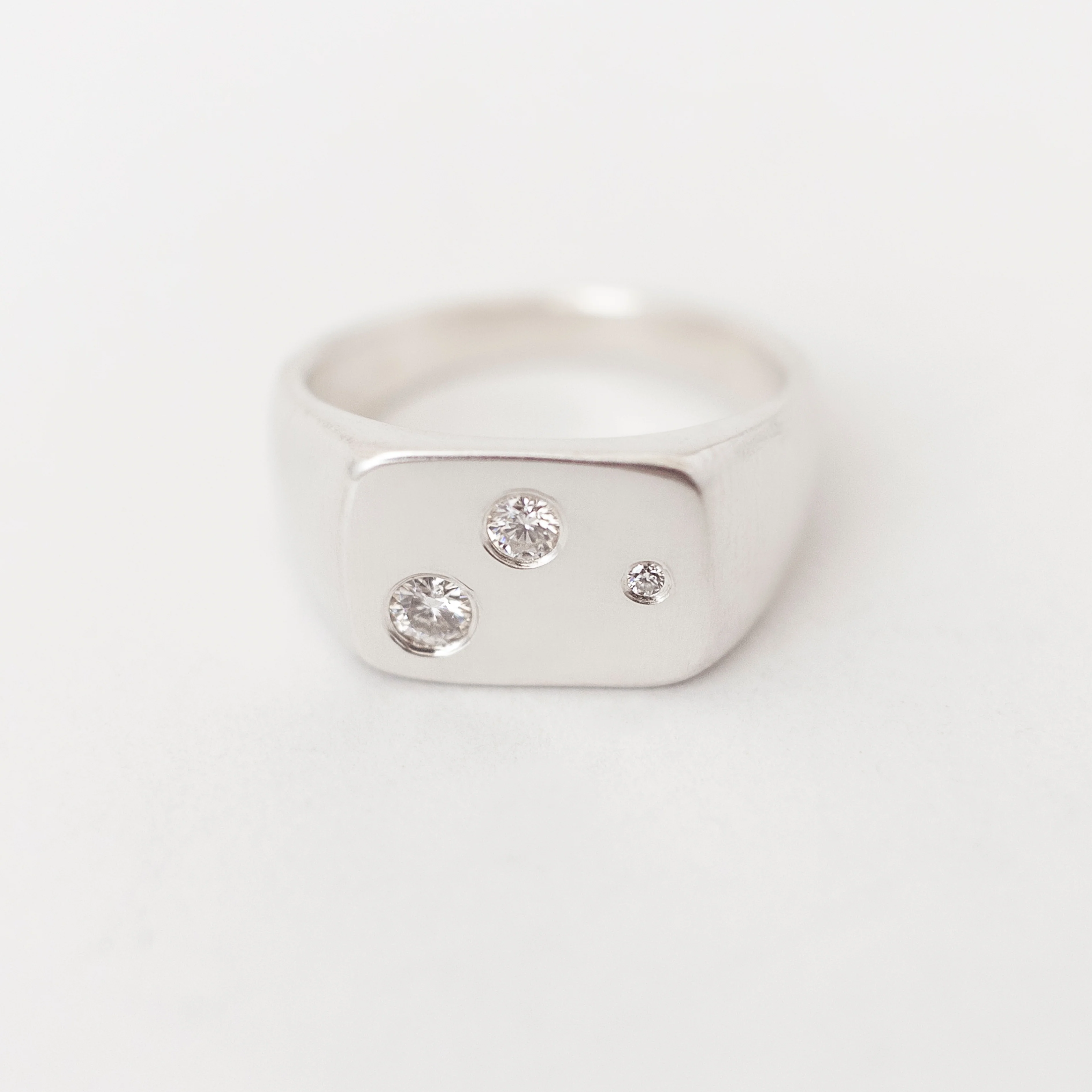 The Ellipse Trois signet is a rectangle classic with a molten edge. With its incredibly smooth curves, it is a timeless yet versatile piece which can be worn as a pinkie signet or on any other finger, featuring three flush-set Moissanite, reminiscent of a full moon night cycle.