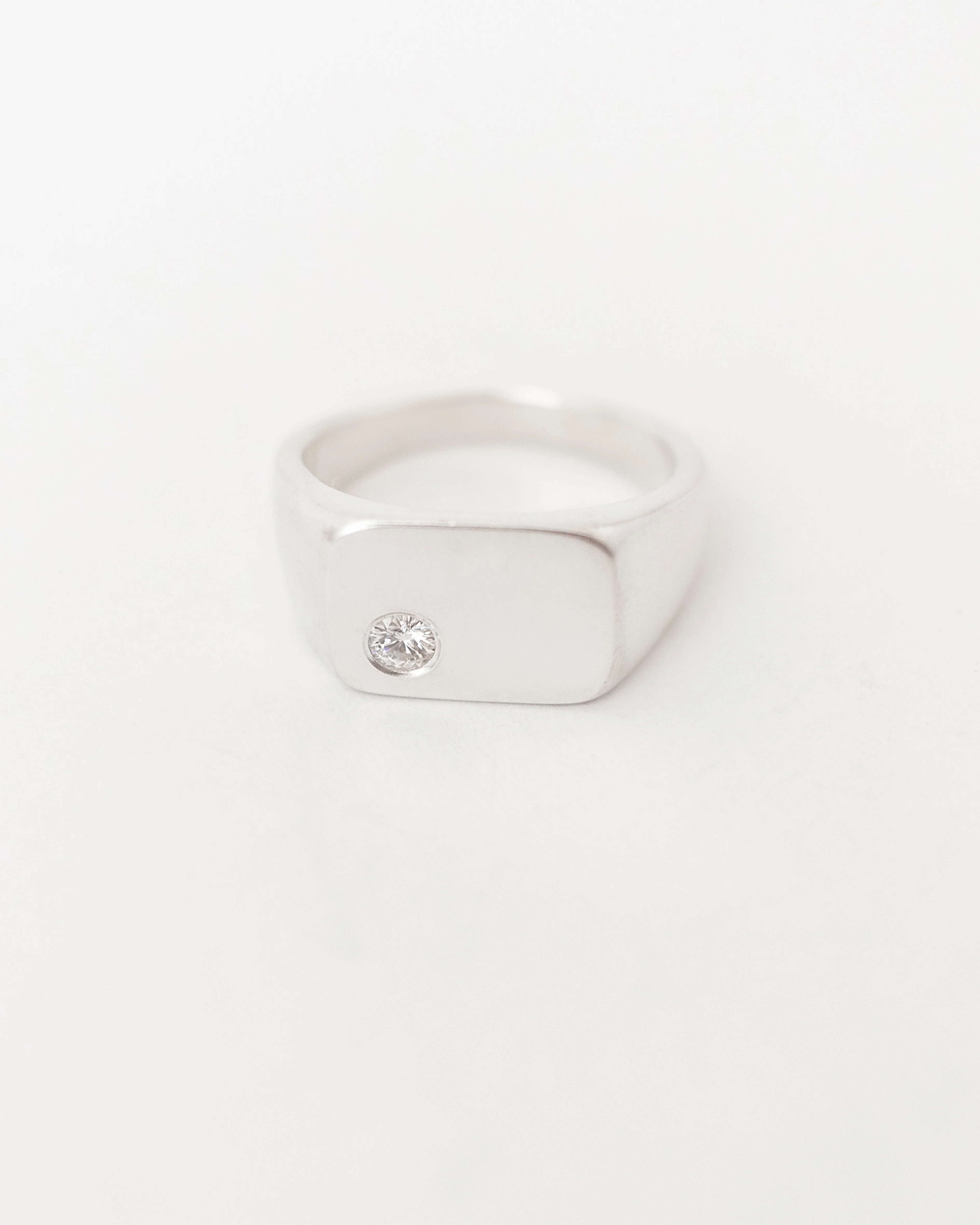 The Ellipse Une signet is a rectangle classic with a molten edge. With its incredibly smooth curves, it is a timeless yet versatile piece which can be worn as a pinkie signet or on any other finger, featuring one fush-set Natural White Diamond or Moissanite, reminiscent of a full moon on a silvery night.