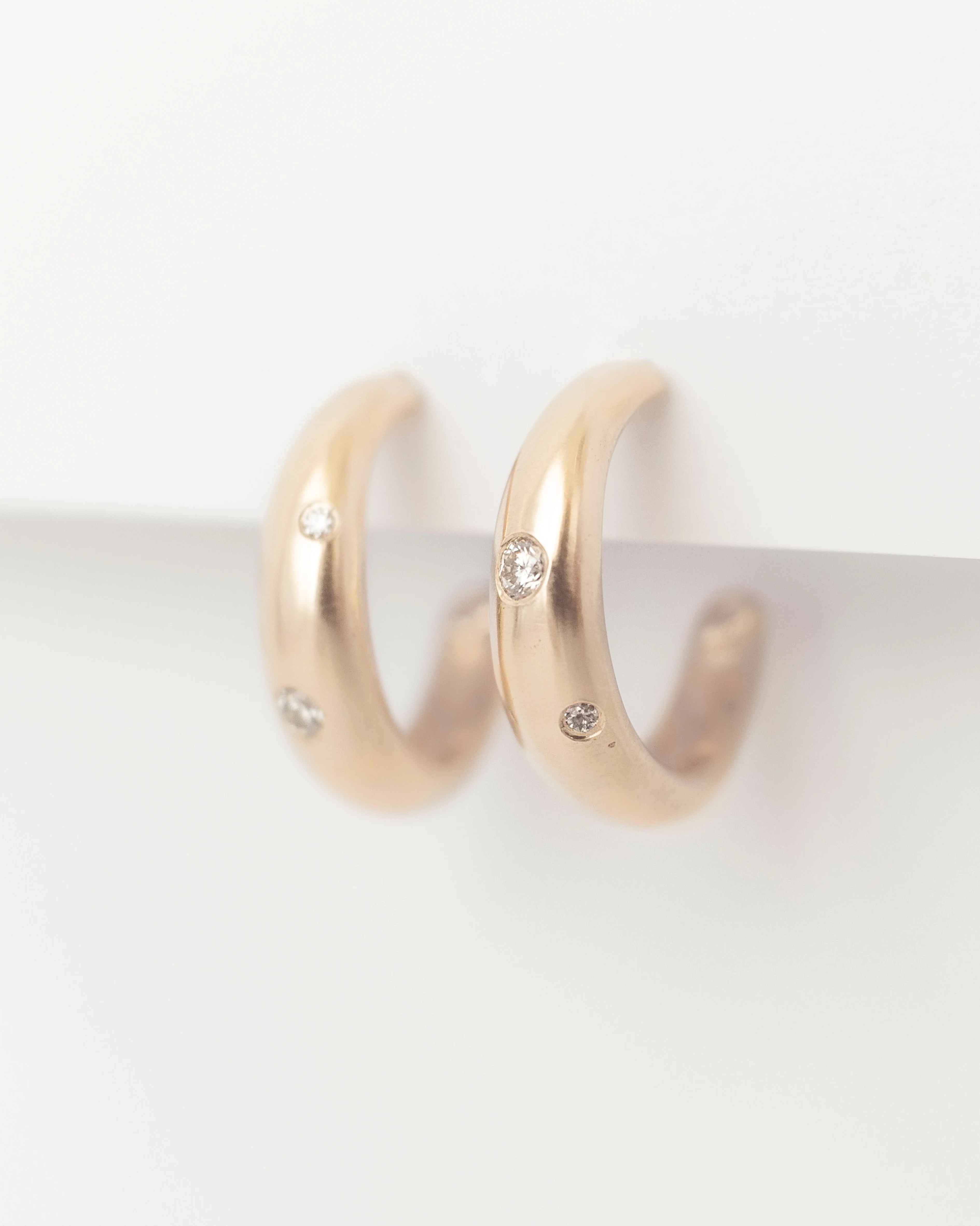 Shimmering crescent moons for your lobes - these classic, yet organic earrings feature smooth, molten curves and two flush-set Natural Diamonds or Moissanites reminiscent of a full moon and a lone star on a golden night.