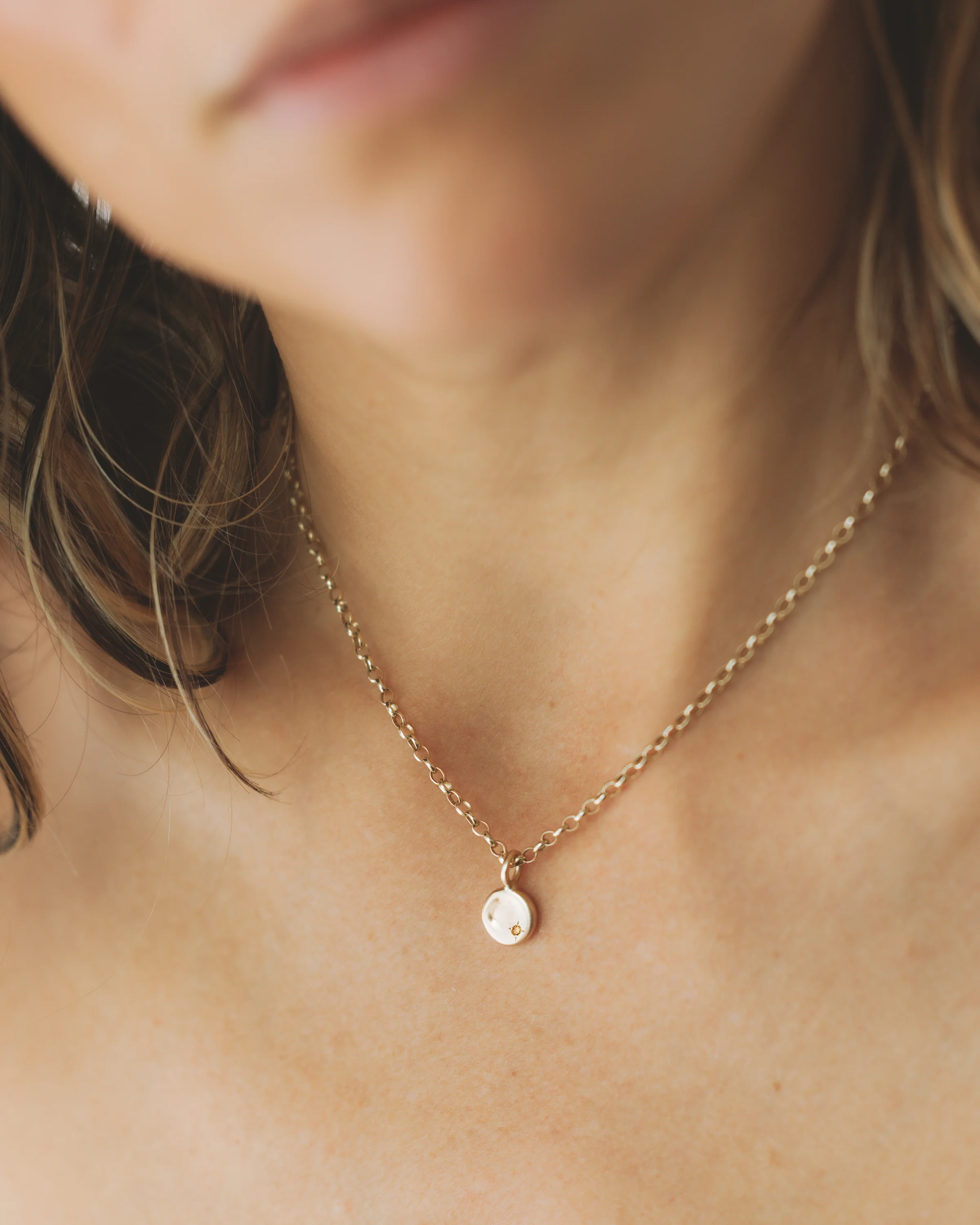 The Baby Moon Birthstone Necklace embodies our signature molten and organic form in a mini gold disc, its buttery curves & fluidity echoing the imperfect beauty and strength of motherhood.