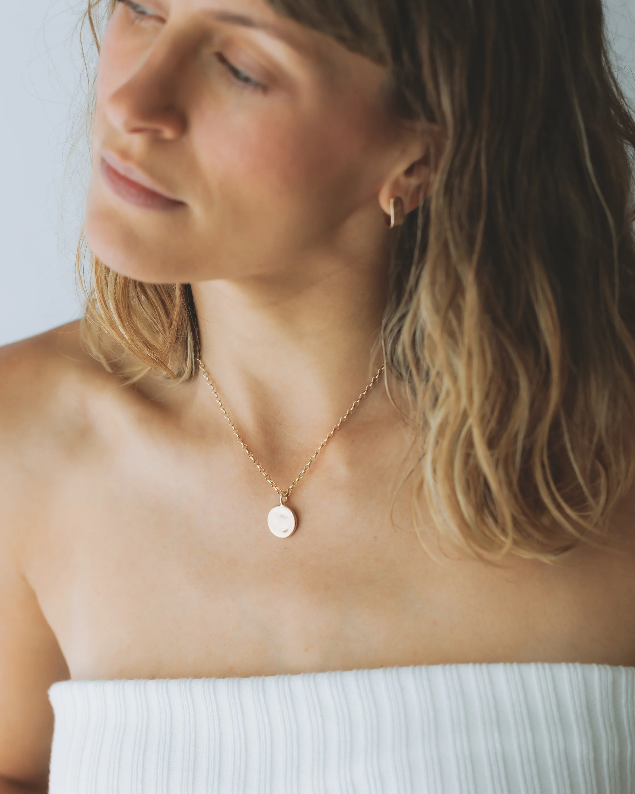 The Mother Moon Necklace embodies our signature molten and organic form in a statement gold disc, its buttery curves & fluidity echoing the imperfect beauty and strength of motherhood.