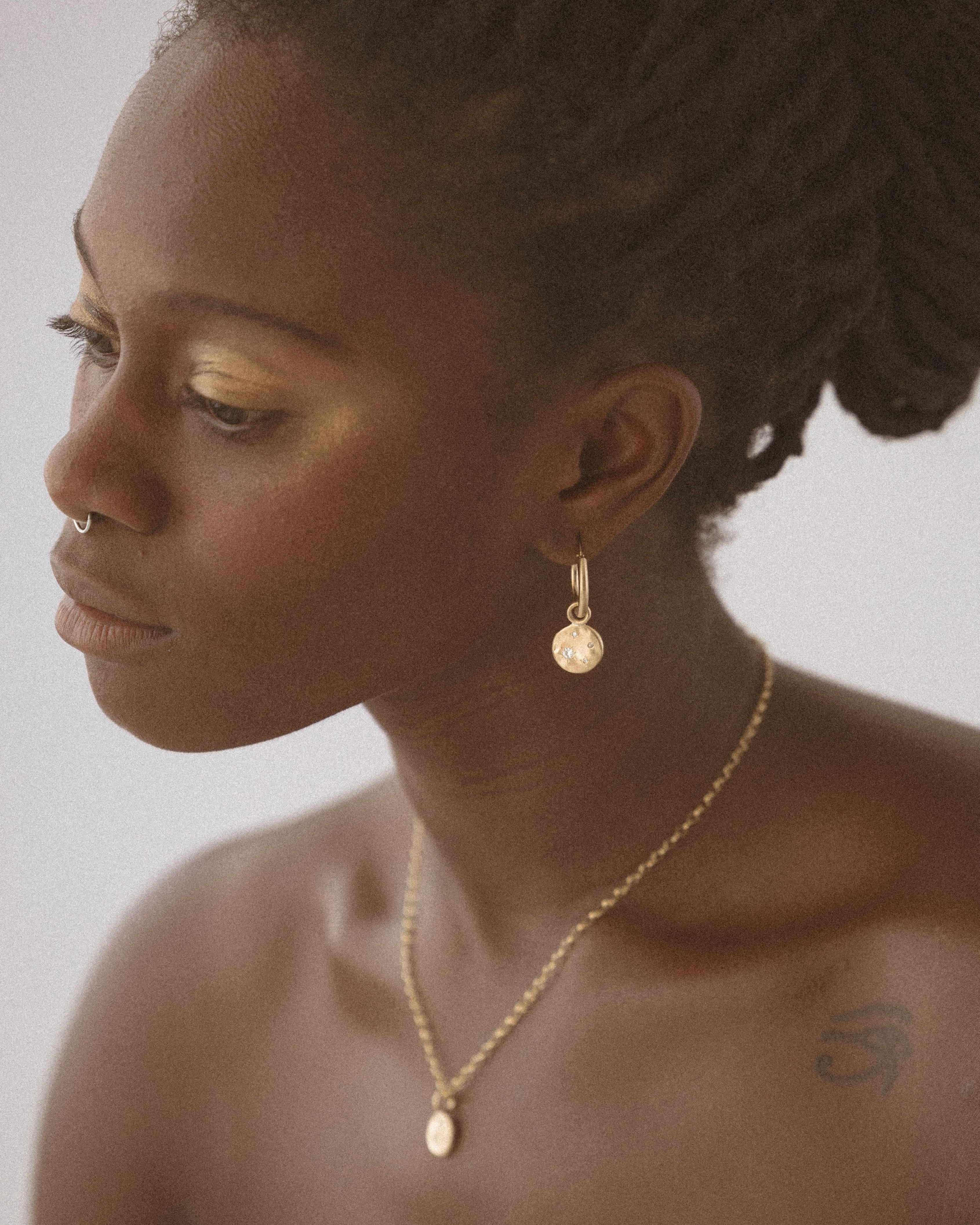 The large starry night hoops feature two molten gold discs reminiscent of a golden night sky, set with scintillating Moissanites surrounded by hand-engraved 4-point stars.