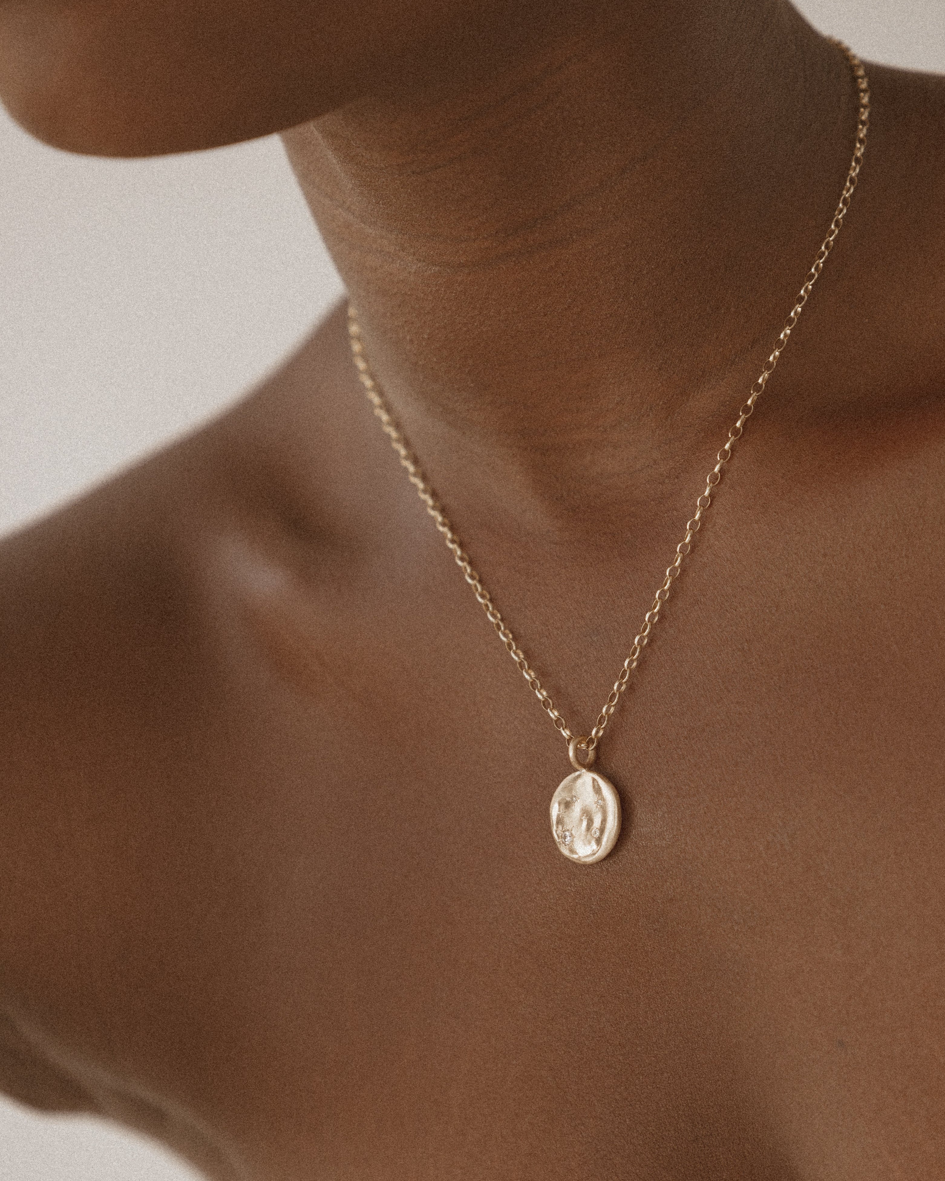 The Cosmos starry night necklace is a statement molten gold disc reminiscent of a golden night sky, featuring four scintillating Diamonds or Moissanites surrounded by hand-engraved 4-point stars.