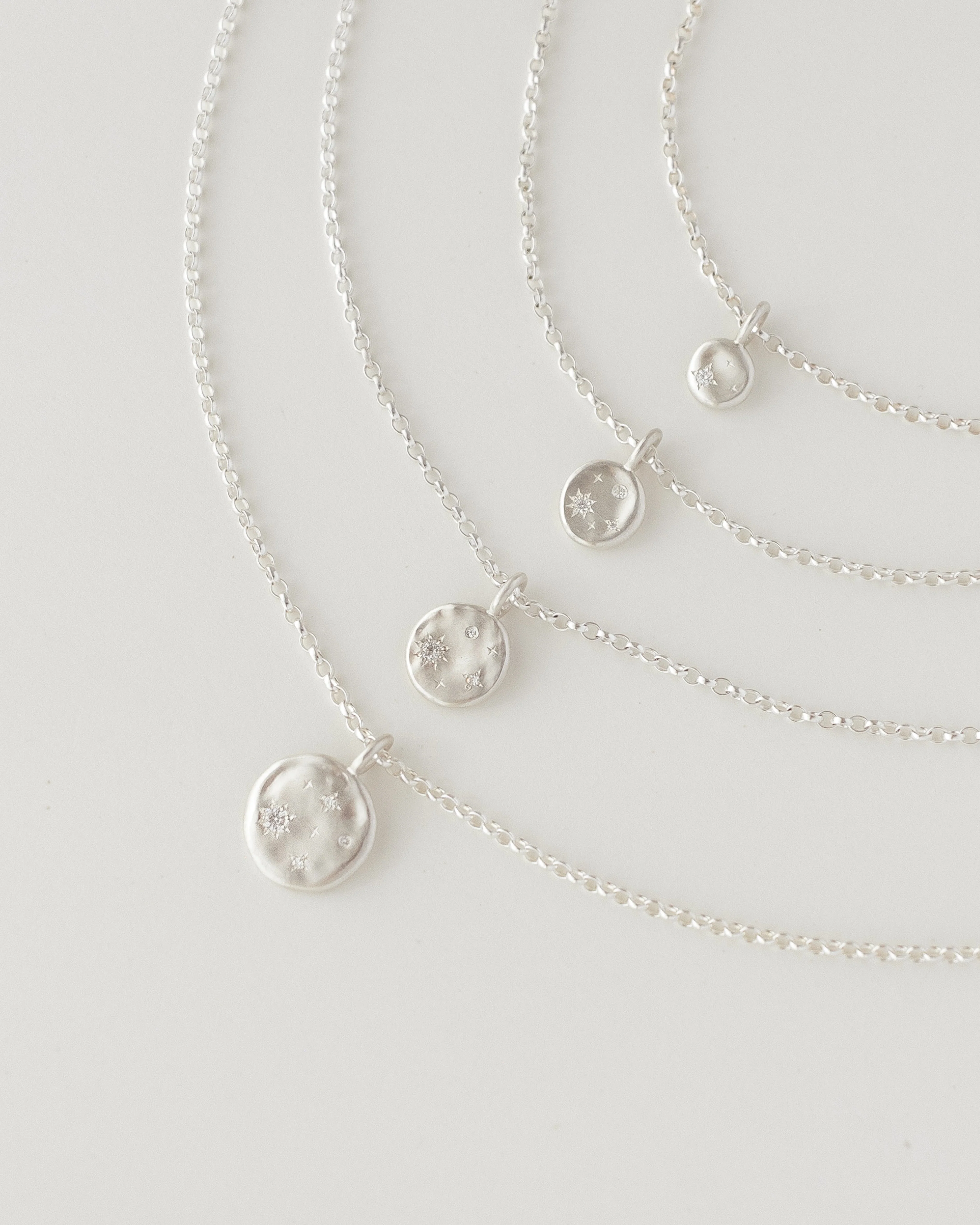 The Cosmos starry night necklace is a statement molten silver disc reminiscent of a glimmering night sky, featuring four scintillating Diamonds or Moissanites surrounded by hand-engraved 4-point stars.