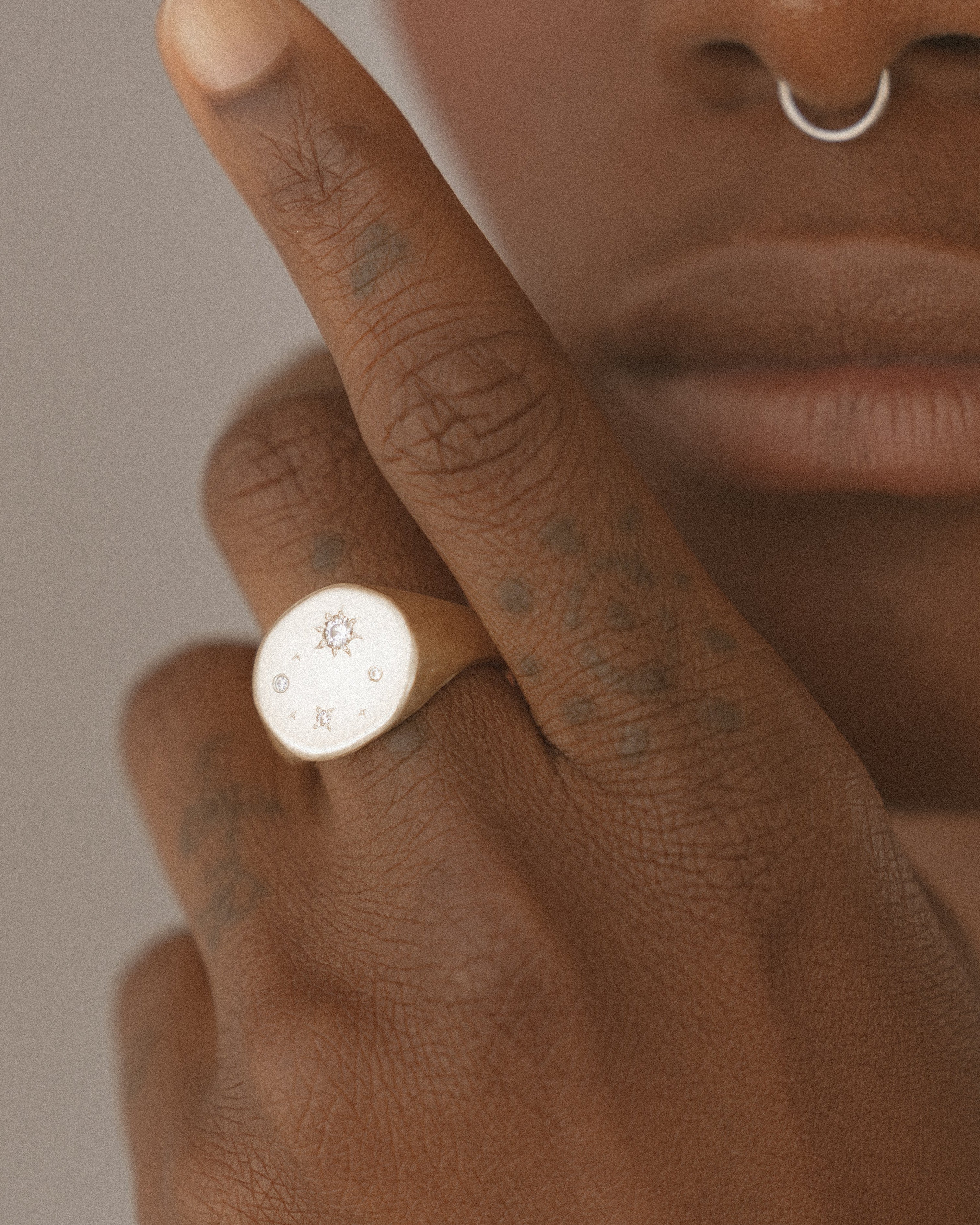 The starry night signet is a statement molten gold disc reminiscent of a golden night sky, featuring four scintillating Diamonds or Moissanites surrounded by hand-engraved 4-point stars.